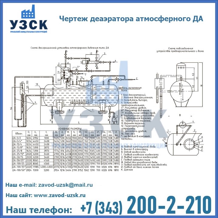 Приобрести качественное оборудование, в том числе, деаэраторы ДА, можно в компании УЗСК в Нижнем Тагиле. Мы предлагаем долговечную и надежную продукцию по приемлемой цене. Заказать и купить деаэраторы или другие изделия высокого качества можно через сайт Уральского Завода Стальных Конструкций, или позвонив по указанному в разделе «Контакты» телефону.